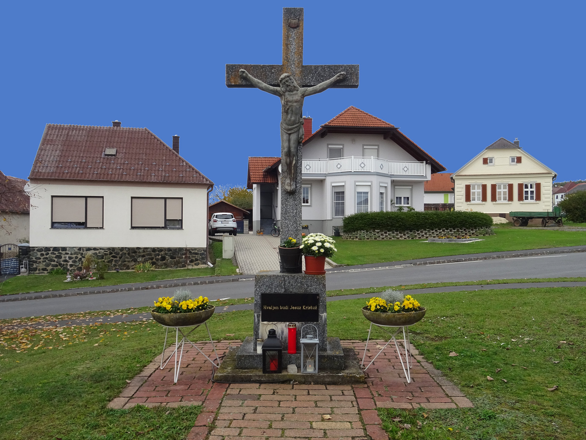Das steinerne Kreuz in Spitzzicken trägt die Inschrift: "Hvaljen budi Jesuz Kristuz" (Gelobt sei Jesus Christus).Spitzzicken, Kreuz