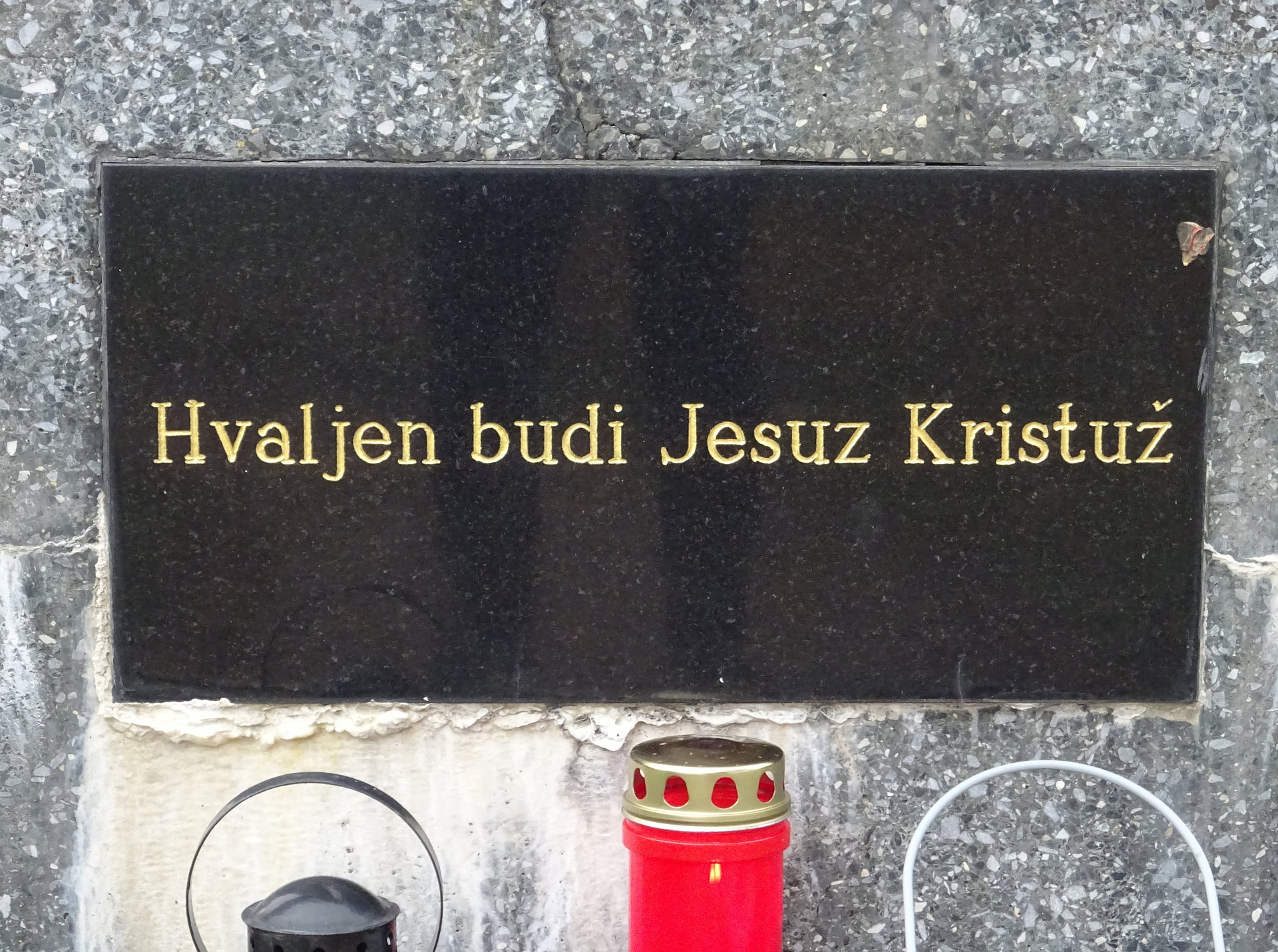 Steinernes Kreuz: Das steinerne Kreuz in Spitzzicken trägt die Inschrift: "Hvaljen budi Jesuz Kristuz" (Gelobt sei Jesus Christus).