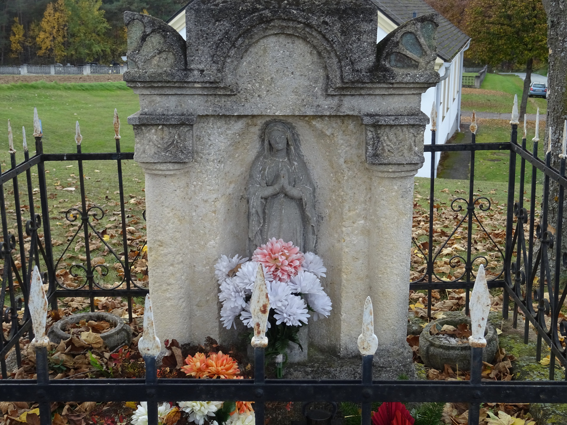 Kriegerdenkmal: Das Soldatendenkmal befindet sich neben der Kirche. Auf einem Hexagon-Fundament steht im Zentrum eine Säule, gekrönt mit EK und dem Relief der Pieta. Rundherum stehen sechs Säulen mit den Namenstafeln.