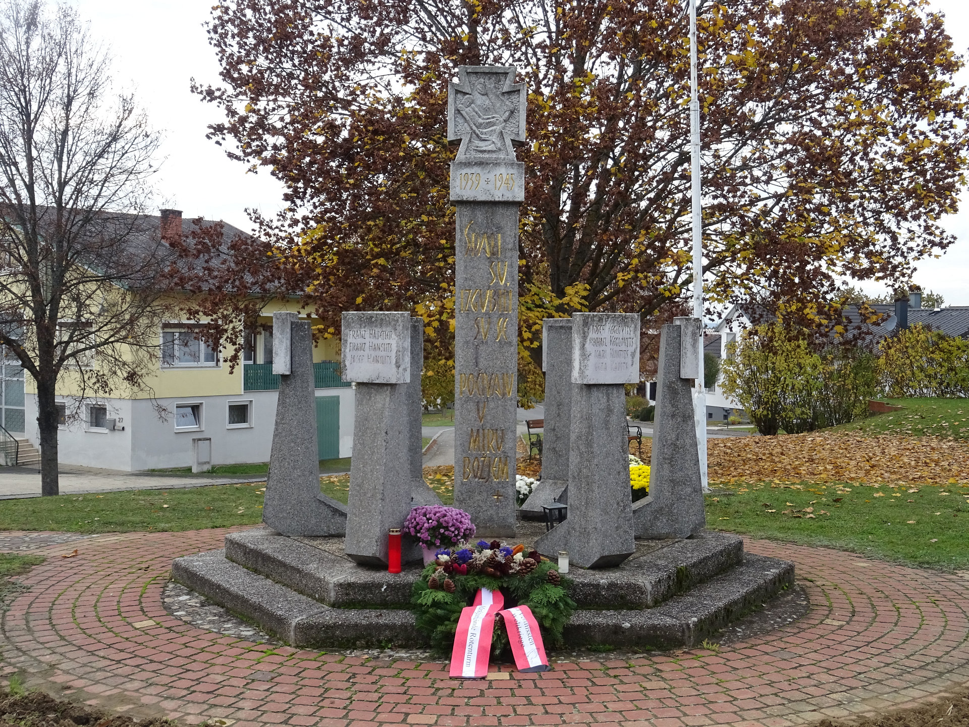 Das steinerne Kreuz in Spitzzicken trägt die Inschrift: "Hvaljen budi Jesuz Kristuz" (Gelobt sei Jesus Christus).Spitzzicken, Kriegerdenkmal