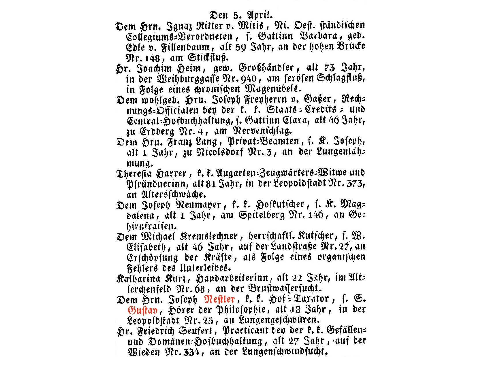 Privatier, † 25.11.1864 im 75 Lebensjahre, Leopoldstadt, Nordbahnstraße 3.