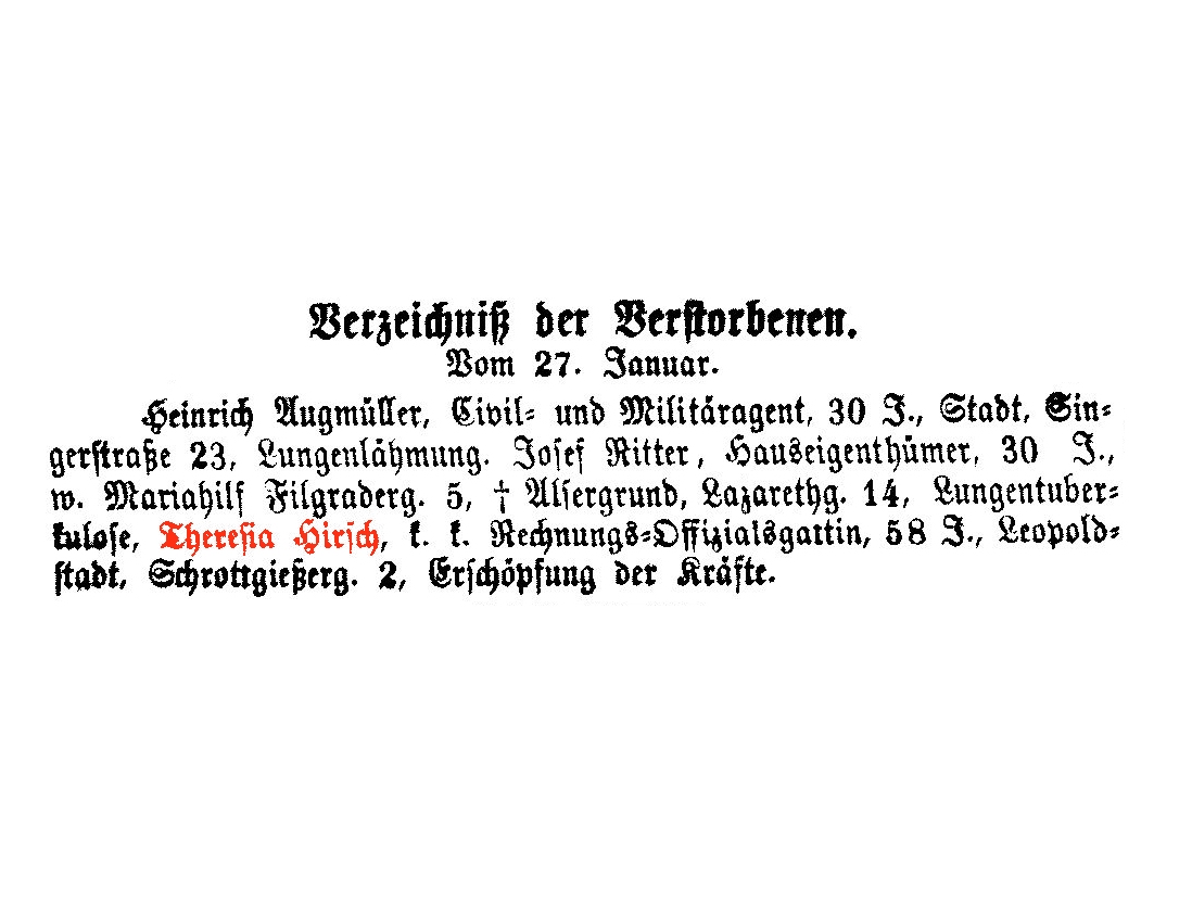k.k. Schätzmeistergattin und Hauseigentümerin, 20.01.1873 im 67. LJ., Landstraße, Steingasse Nr. 25, (Fremden-Blatt vom 23.1.1873, Seite 15), Gatte: Franz Polaczek, k.k. Schätzmeister.