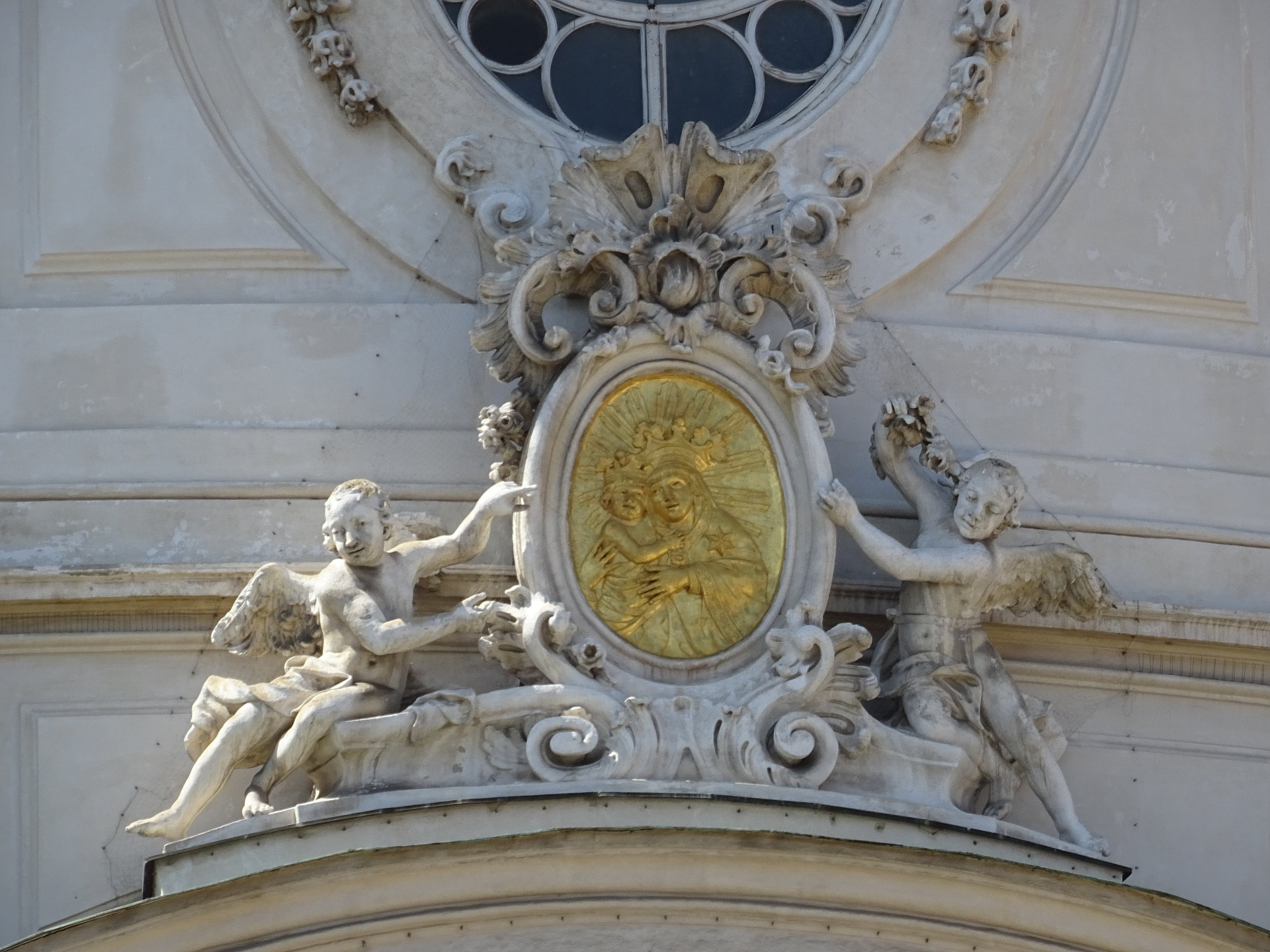 Mariensäule am Jodok-Fink-Platz. Die Zweiturmfassade hat einen leicht vorgewölbten Mittelteil sowie eine Säulengliederung. Von 1858 bis 1860 wurden die beiden 1752 ohne Helm erbauten Türme durch den böhmischen Baumeister Franz Sitte erhöht, mit Spitzdächern versehen und der Fassade ihr heutiges Erscheinungsbild gegeben.
