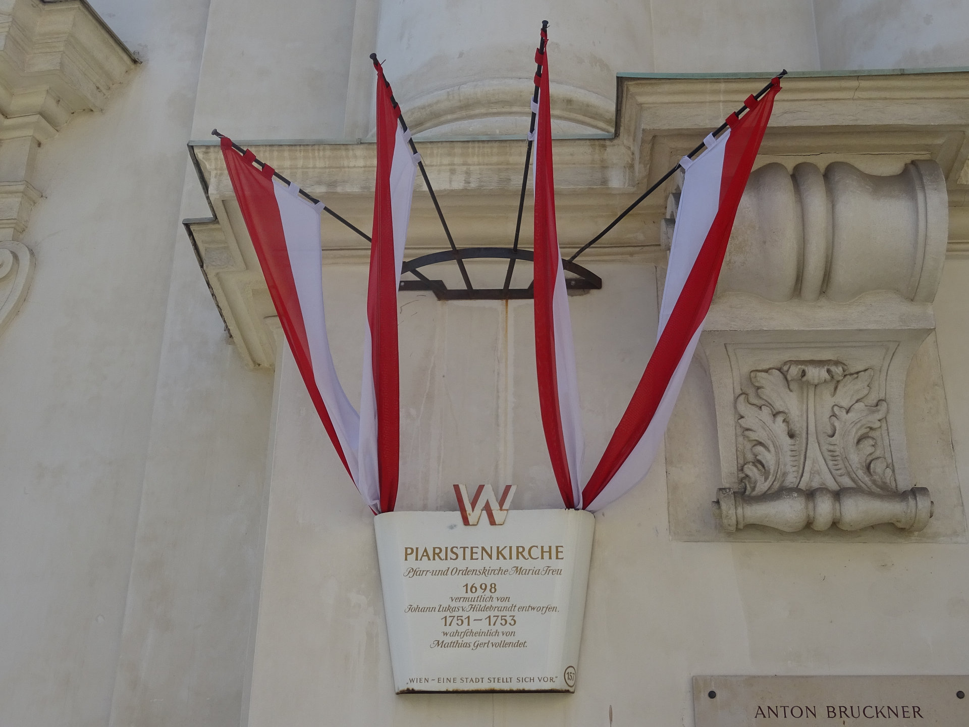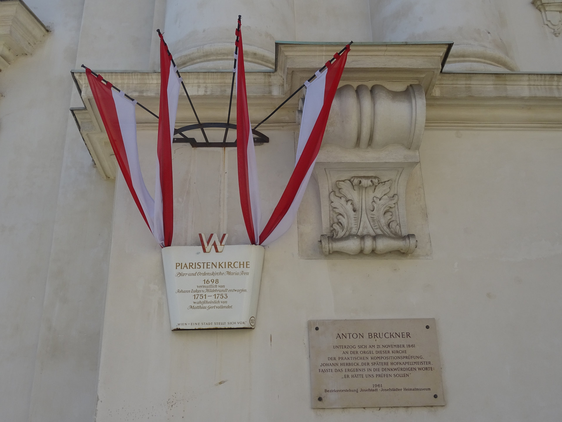 Am 21. November 1861 hat Anton Bruckner auf dieser Orgel seine praktische Kompositionsprüfung abgelegt. Eine Gedenktafel erinnert an das Ereignis und wurde 1961 wurde von der Josefstädter Bezirksvorstehung sowie dem Josefstädter Heimatmuseum gestiftet. Sie hat folgende Inschrift: Anton Bruckner unterzog sich am 21. November 1861 an der Orgel dieser Kirche der praktischen Komponistenprüfung. Johann Herbeck, der spätere Hofkapellmeister fasste das Ereignis in die denkwürdigen Worte: „Er hätte uns prüfen sollen“.