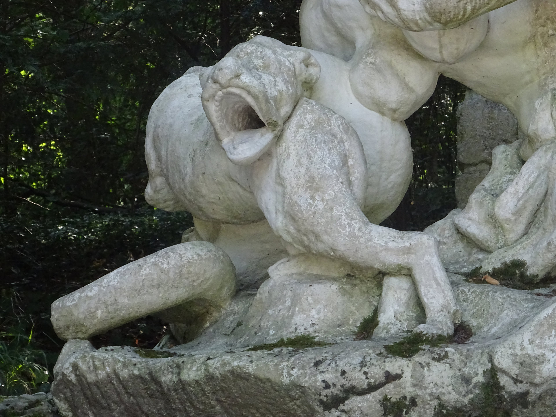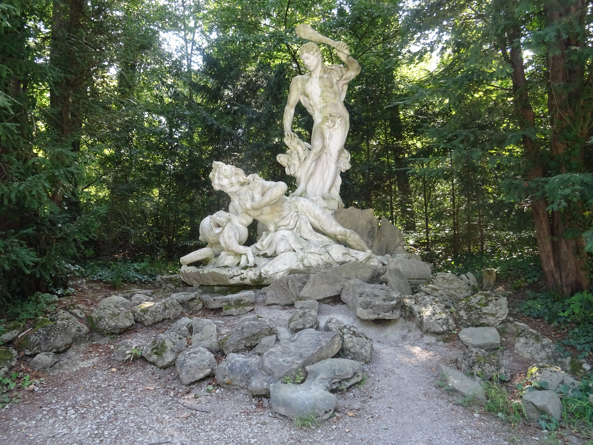 Herkules, Herakles, der mit dem dreiköpfigen Kerberos sowie den Verkörperungen von Neid und anderen Lastern kämpft (eine alte gehässige Frau, ein Hund und eine Schlange mit Hundekopf). Diese Figur wurde von Hohenberg bereits 1771 angekauft und in der Waldschneise aufgestellt, die auf die Römische Ruine zuläuft und die in heute kaum noch erkennbare Terrassenstufen gegliedert ist. Pläne, eine Kaskade zu bauen, in welcher der tugendhafte Herkules gleichsam eine Sintflut auf das untergehende Karthago hinabschickt, wurden aber sowohl aus Geld- wie aus Wassermangel nie umgesetzt.