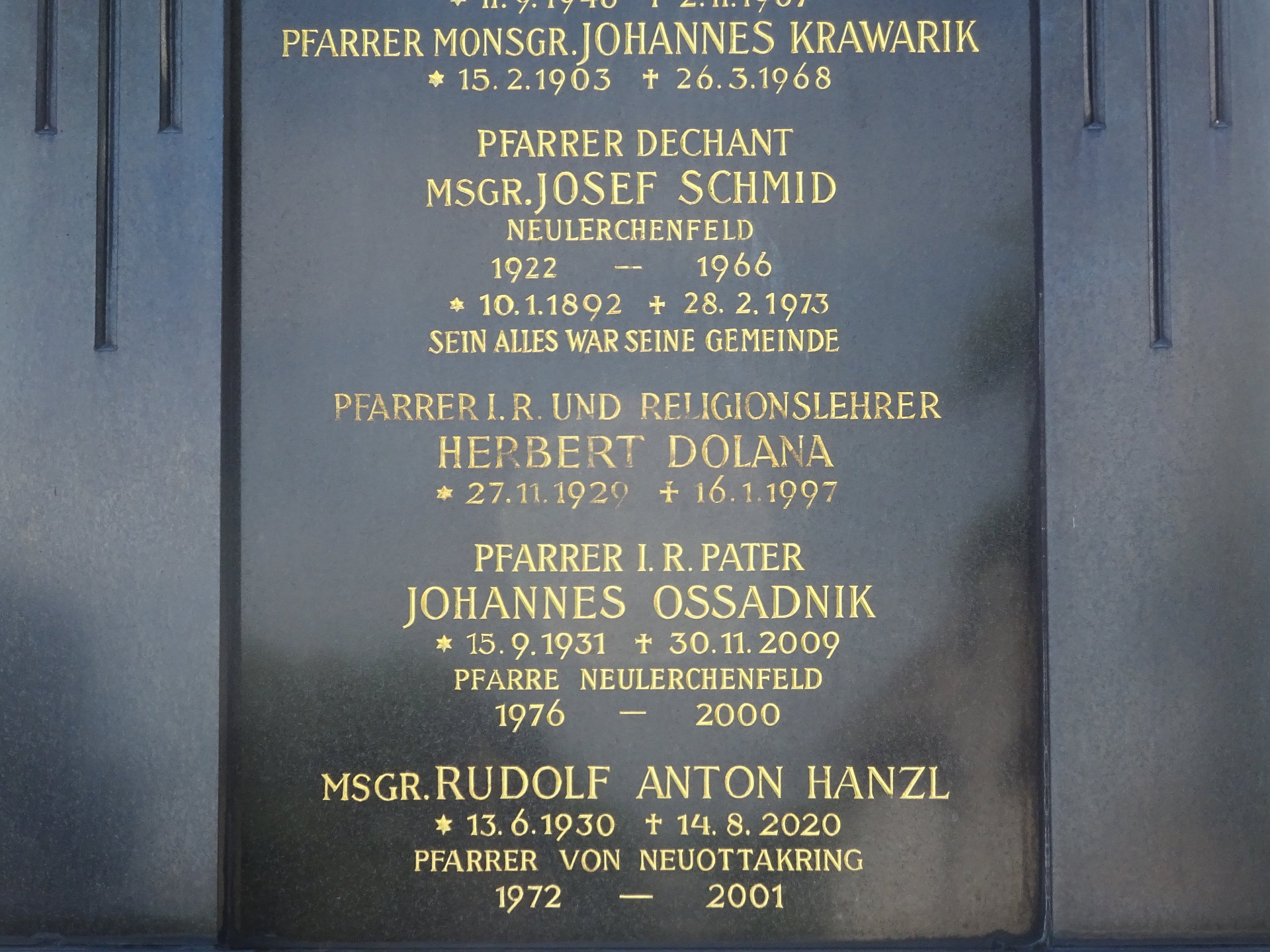 Monsignore Rudolf Anton Hanzl, Hanzl wurde am 29. Juni 1955 von Kardinal Innitzer zum Priester geweiht. Kinder- und Jugendseelsorger in der Pfarre Neuottakring (1959-1969), Pfarrer der Pfarre Maria Namen (1969-1972), Pfarrer von Neuottakring (1972-2001), * 13.06.1930 in Kittsee, † 14.08.2020, Bestattungsdatum: 31.08.2020.