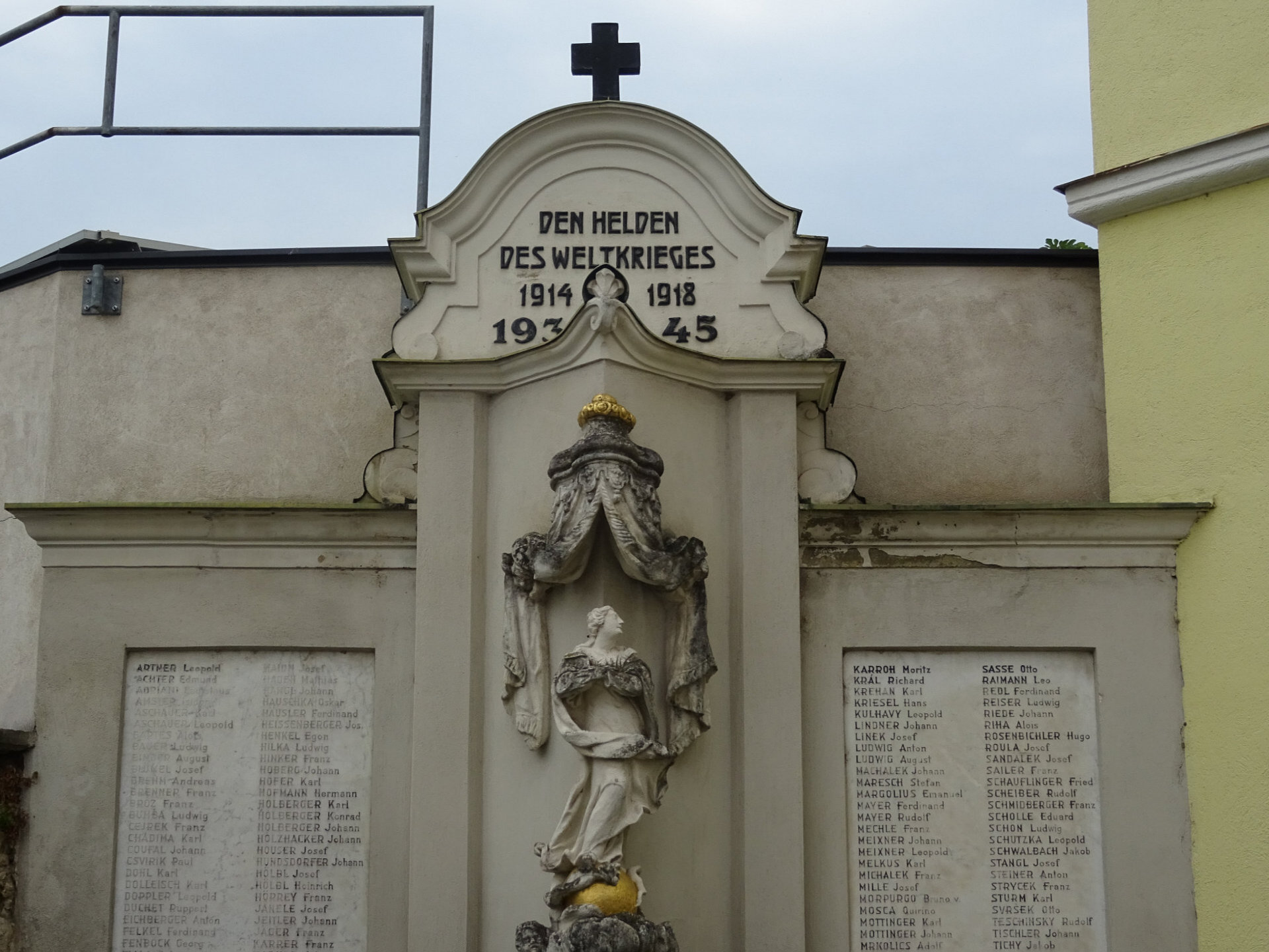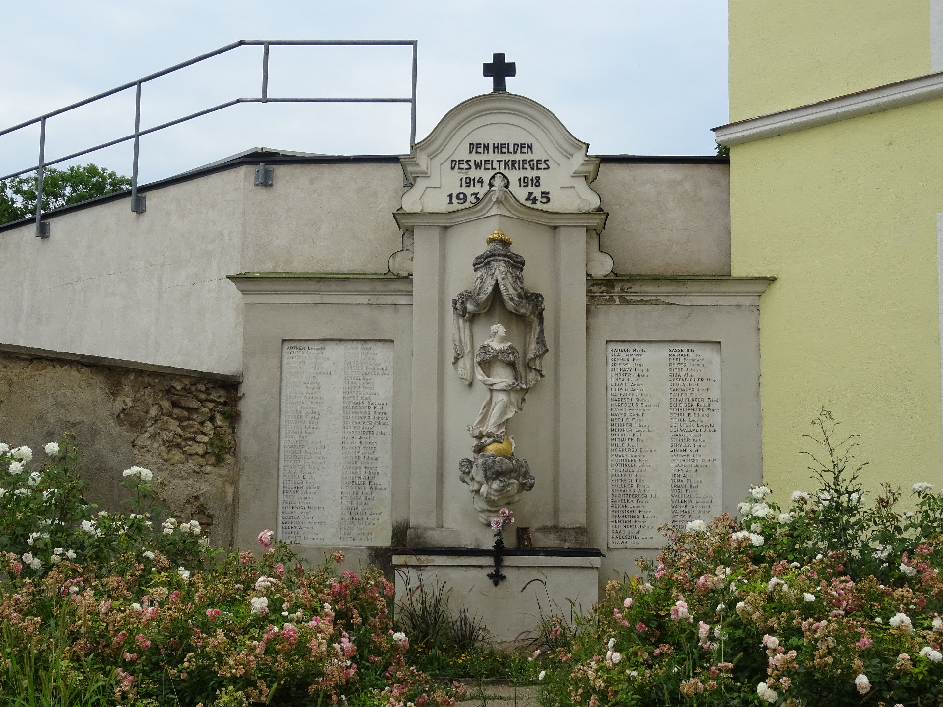 Das Soldatendenkmal beinhaltet eine von einem steinernen Zierdach (Baldachin) geschützte Maria-Imaculata-Figur