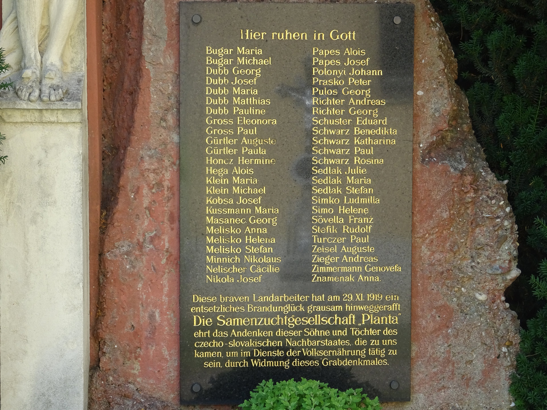 Gedenkstein Samenzuchtgesellschaft "Planta": Die Samenzuchtgesellschaft Aktiengesellschaft (Planta Österreichische Samenzucht) wurde 1920 gegründet und besaß die Gutswirtschaft Markgrafneusiedl sowie eine Obst- und Gemüseverwertungsfabrik in Münchendorf. Auf dem Friedhof befindet sich eine Gedenktafel mit der Inschrift: "Diese braven Landarbeiter hat am 29.XI.1919 ein entsetzliches Brandunglück grausam hinweggerafft. Die Samenzuchtgesellschaft "Planta" ehrt das Andenken dieser Söhne und Töchter des czecho-slovakischen Nachbarstaates, die zu uns kamen, um im Dienste der Volksernährung tätig zu sein, durch Widmung dieses Grabdenkmales".