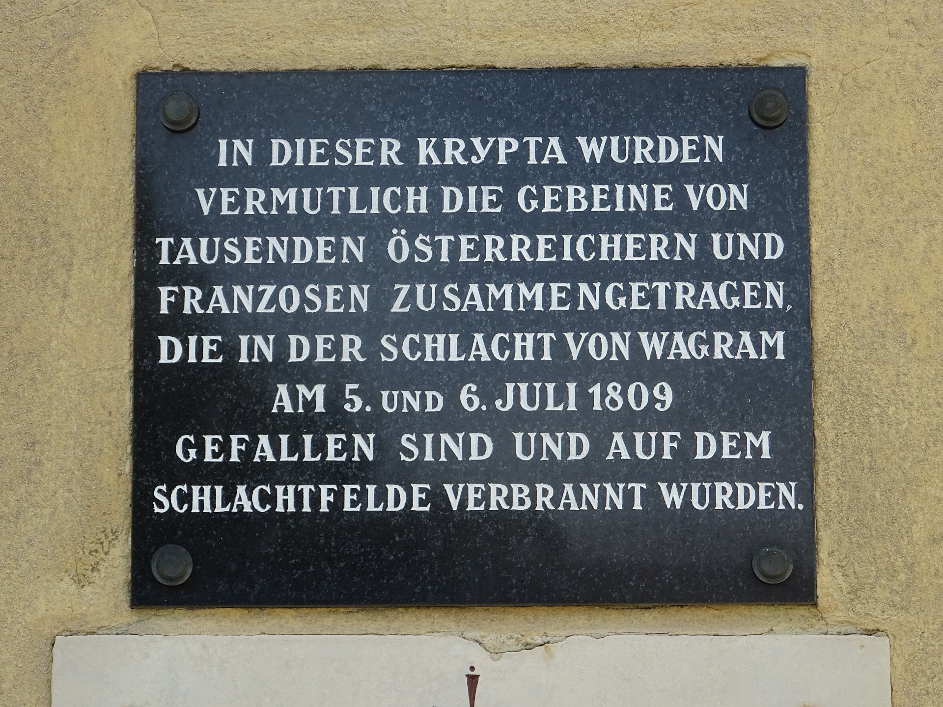 Krypta: In der Krypta wurden vermutlich die Gebeine von tausenden Österreichern und Franzosen zusammengetragen, die in der Schlacht von Wagram am 5. und 6. Juli 1809 gefallen sind und auf dem Schlachtfelde verbrannt wurden.