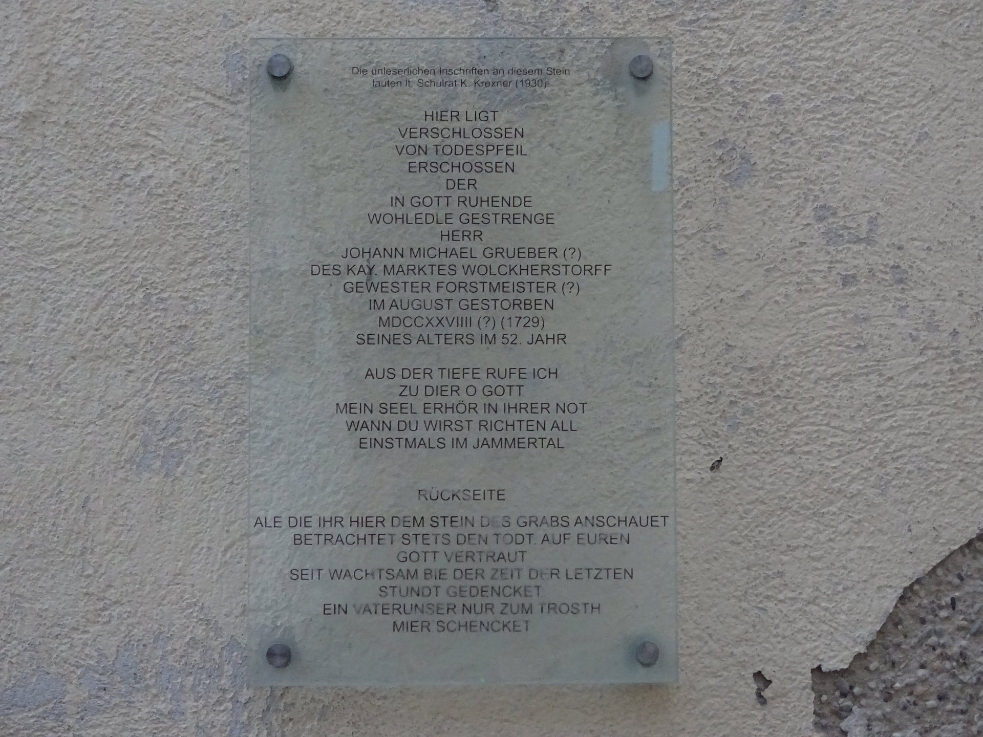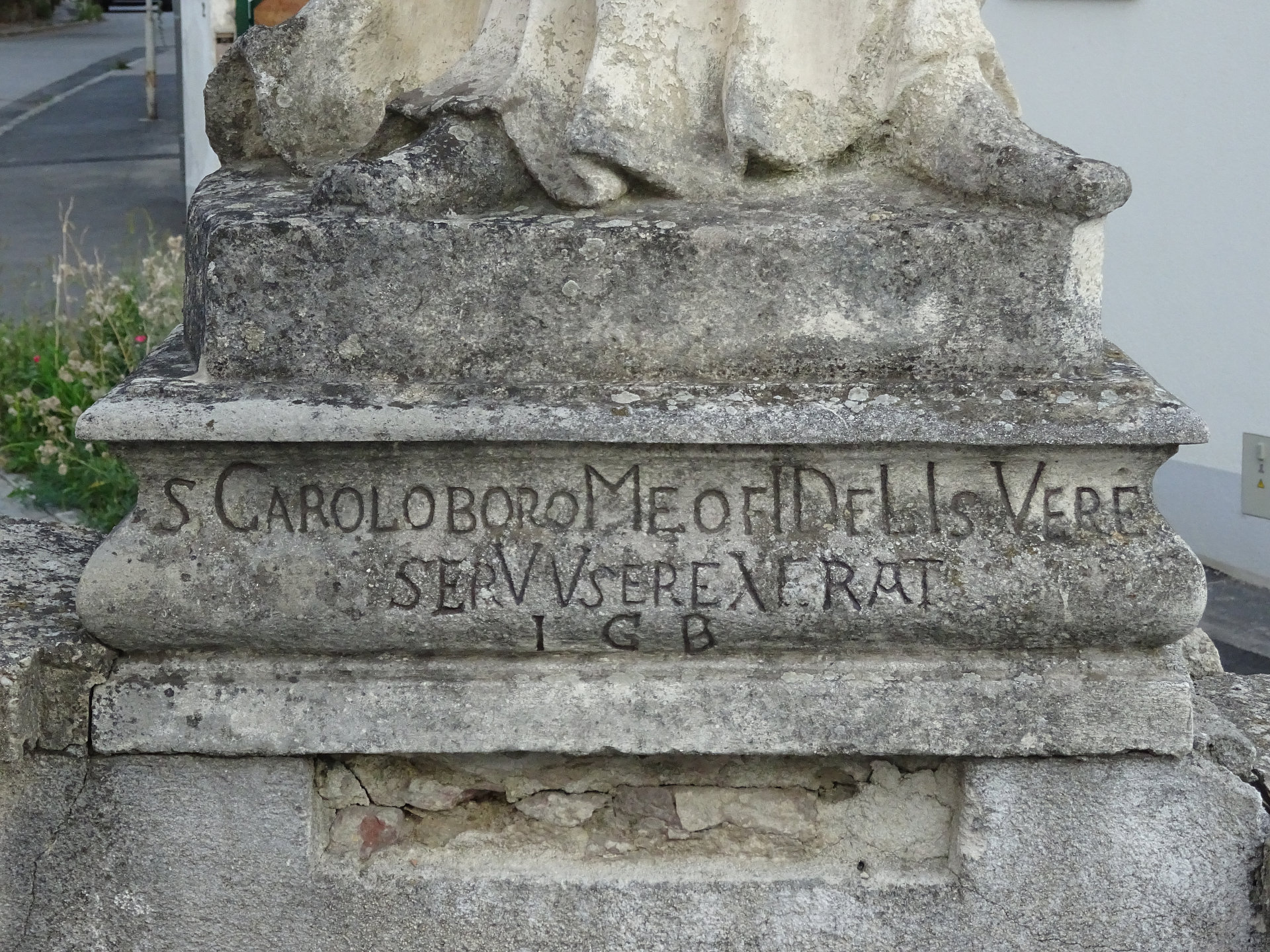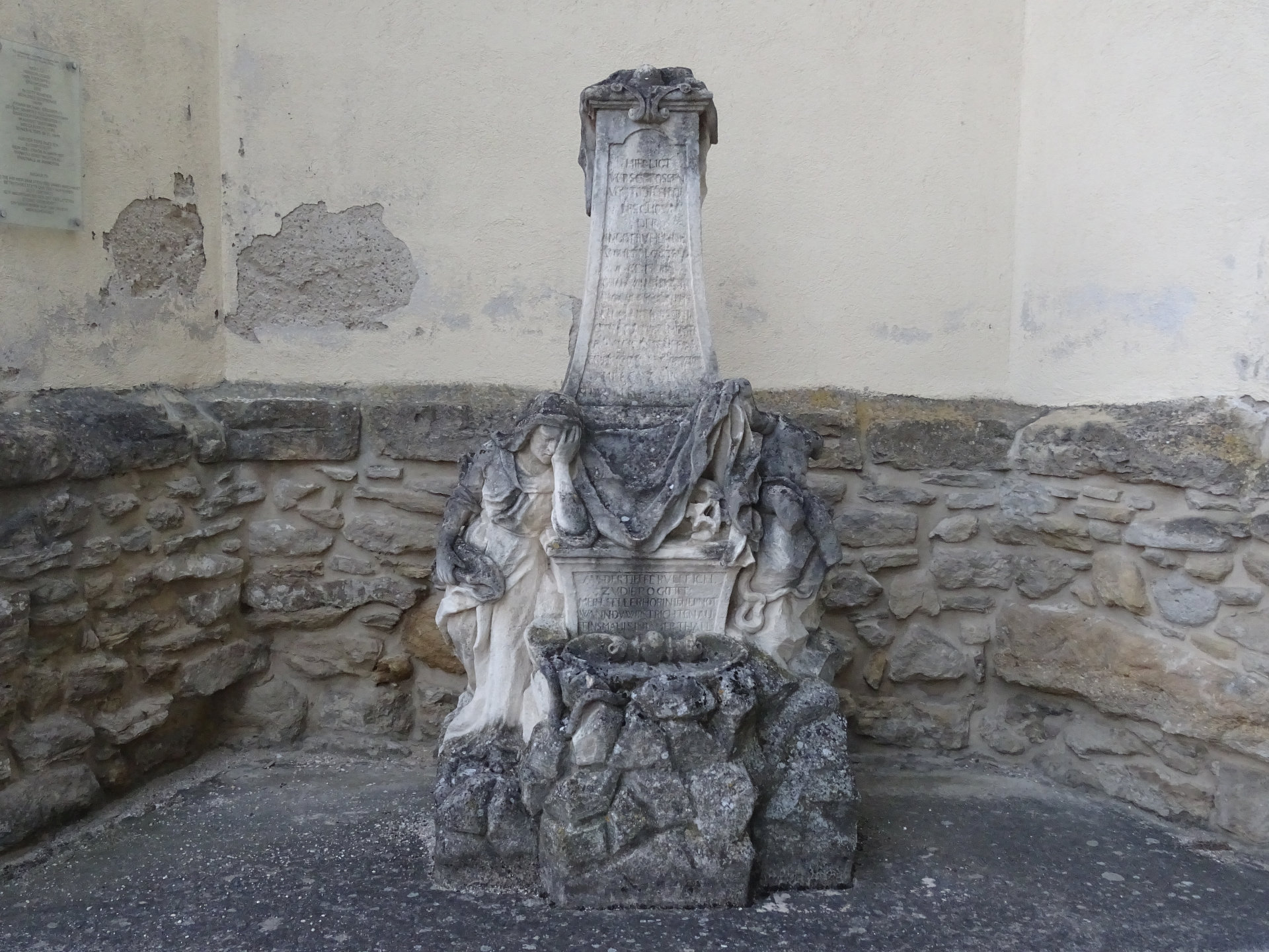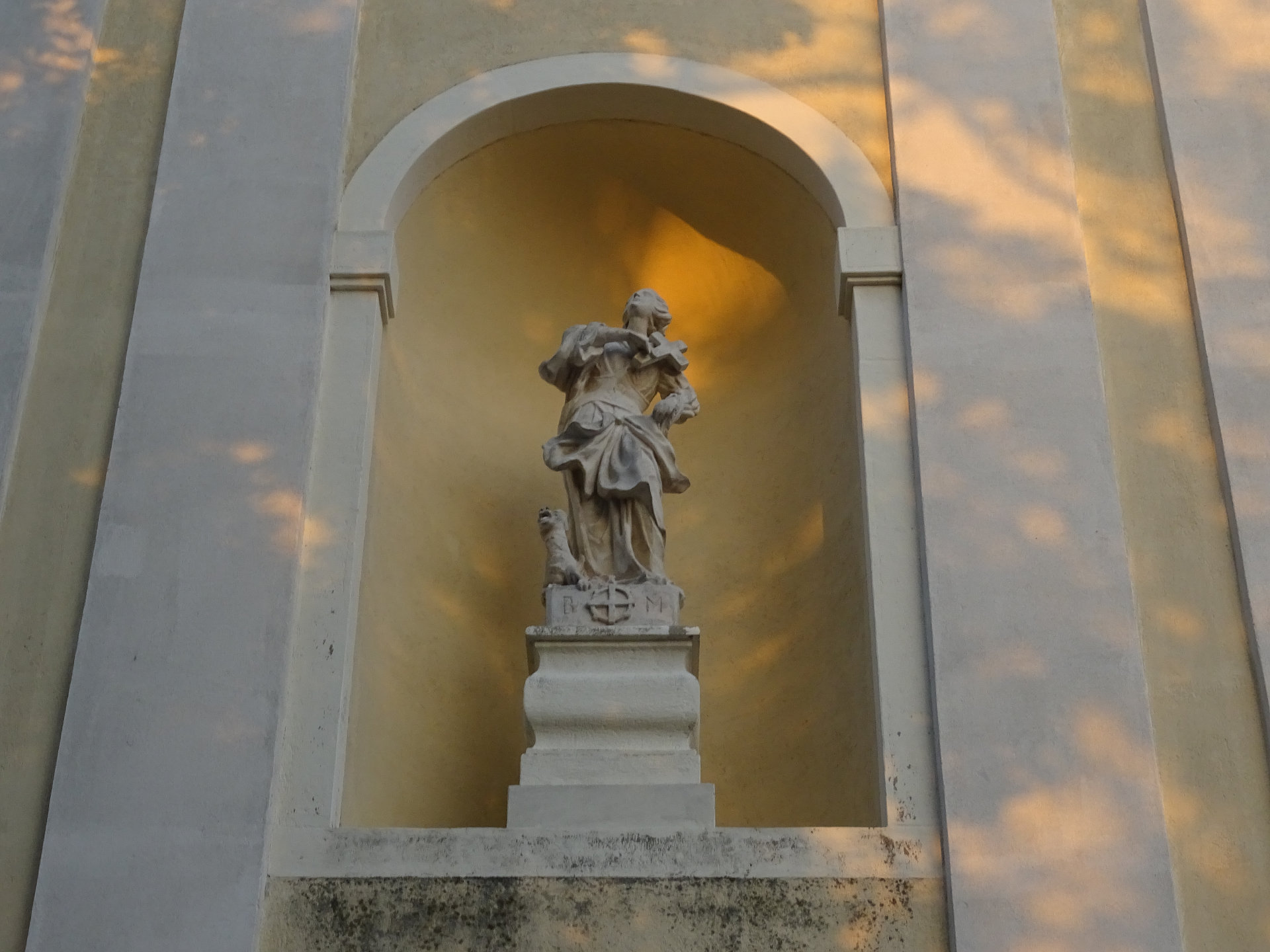 Am Treppenaufgang zur Kirche stehen sechs barocke Steinfiguren von 1727. Sie stellen den heiligen Josef, die heilige Maria Immaculata, den heiligen Leopold, den heiligen Karl Borromäus, den heiligen Johannes Nepomuk und den heiligen Florian dar.