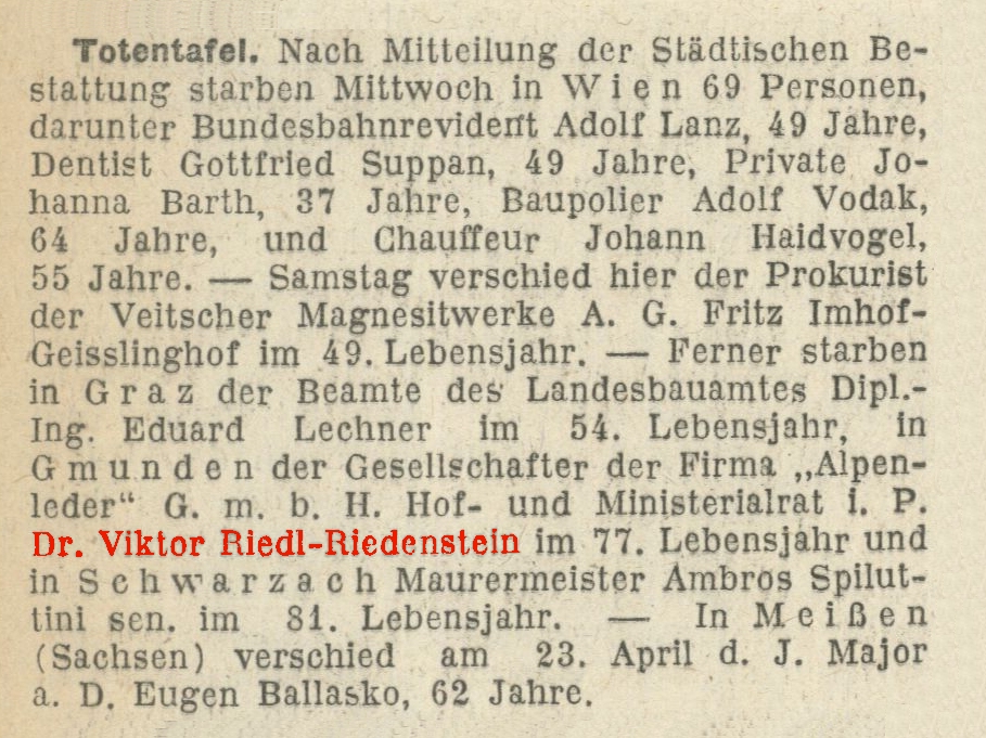 Dr. Victor Riedl von Riedenstein, K.u.K. Hof- und Ministerialrat im K.u.K. Ministerium des Äußeren, Gesellschafter der Firma „Alpenleder" G.m.b.H., * 27.12.1872, † 04.05.1949, Bestattungsdatum: 09.05.1949