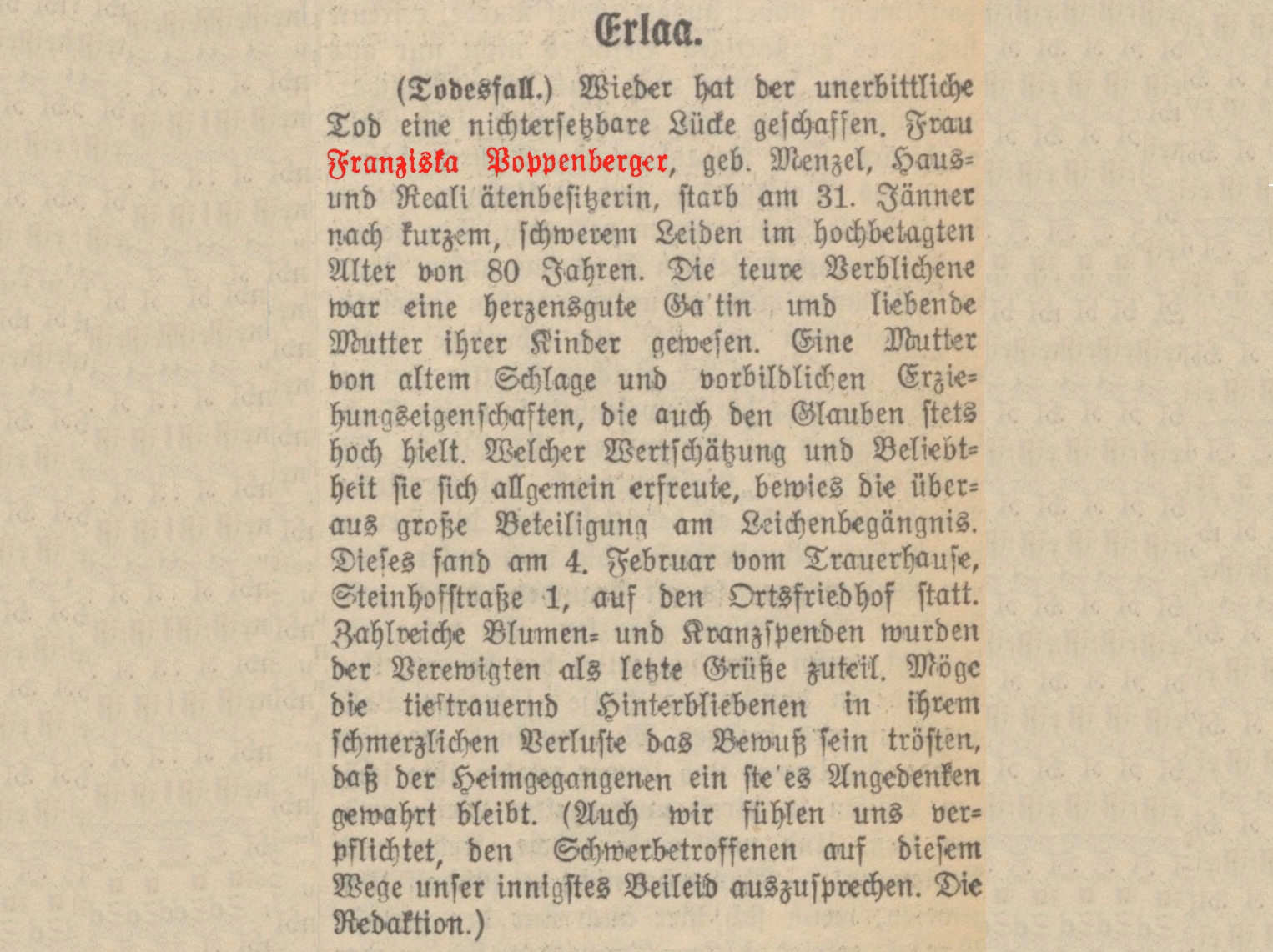Franziska Poppenberger, geb. Menzel, * 10.04.1851, † 31.01.1931, Bestattungsdatum: 04.02.1931, zuletzt wohnhaft: 23., Steinhofstraße 1