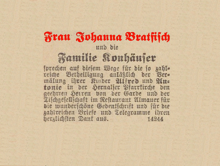 Antonia (Antonie) Konhäuser, geb. Linka (Stieftochter von Bratfisch), * 30.03.1871, † 02.03.1960, zuletzt wohnhaft: 17., Dornbacherstraße 19, parterre.