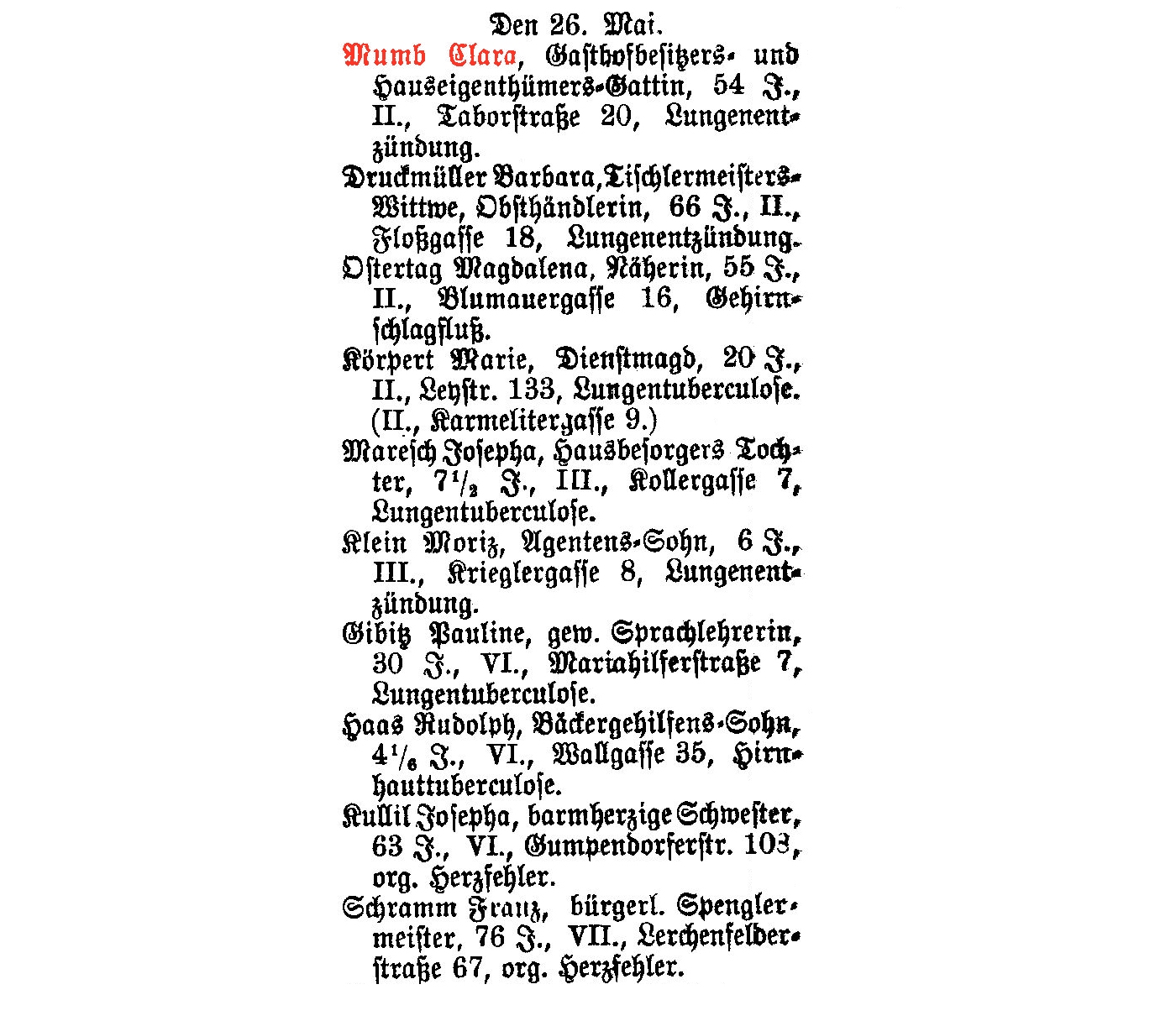 Taborstraße 20, Lungenentzündung.