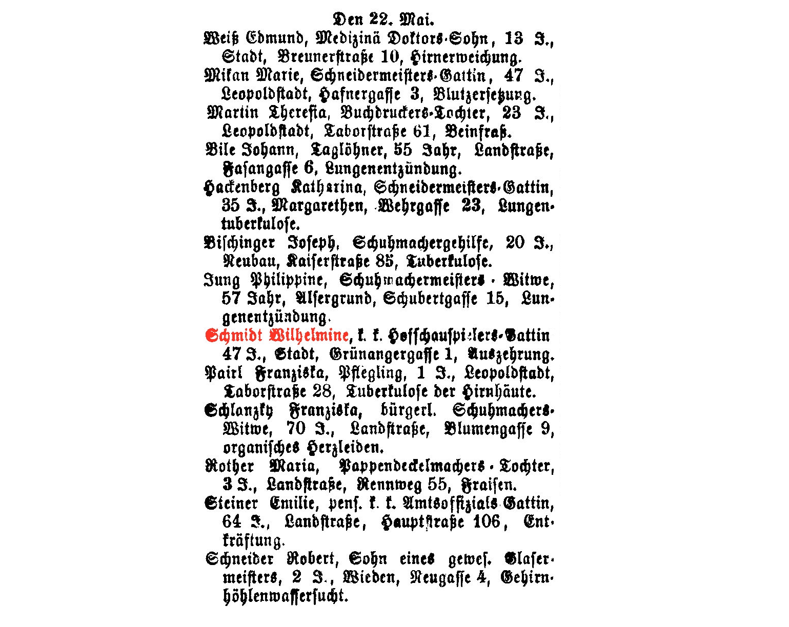 Wiener Zeitung vom 27.5.1863, Seite 12: Schmidt Wilhelmine, k. k. Hofschauspielers-Gattin, 47 J., Stadt, Grünangergasse 1, Auszehrung.