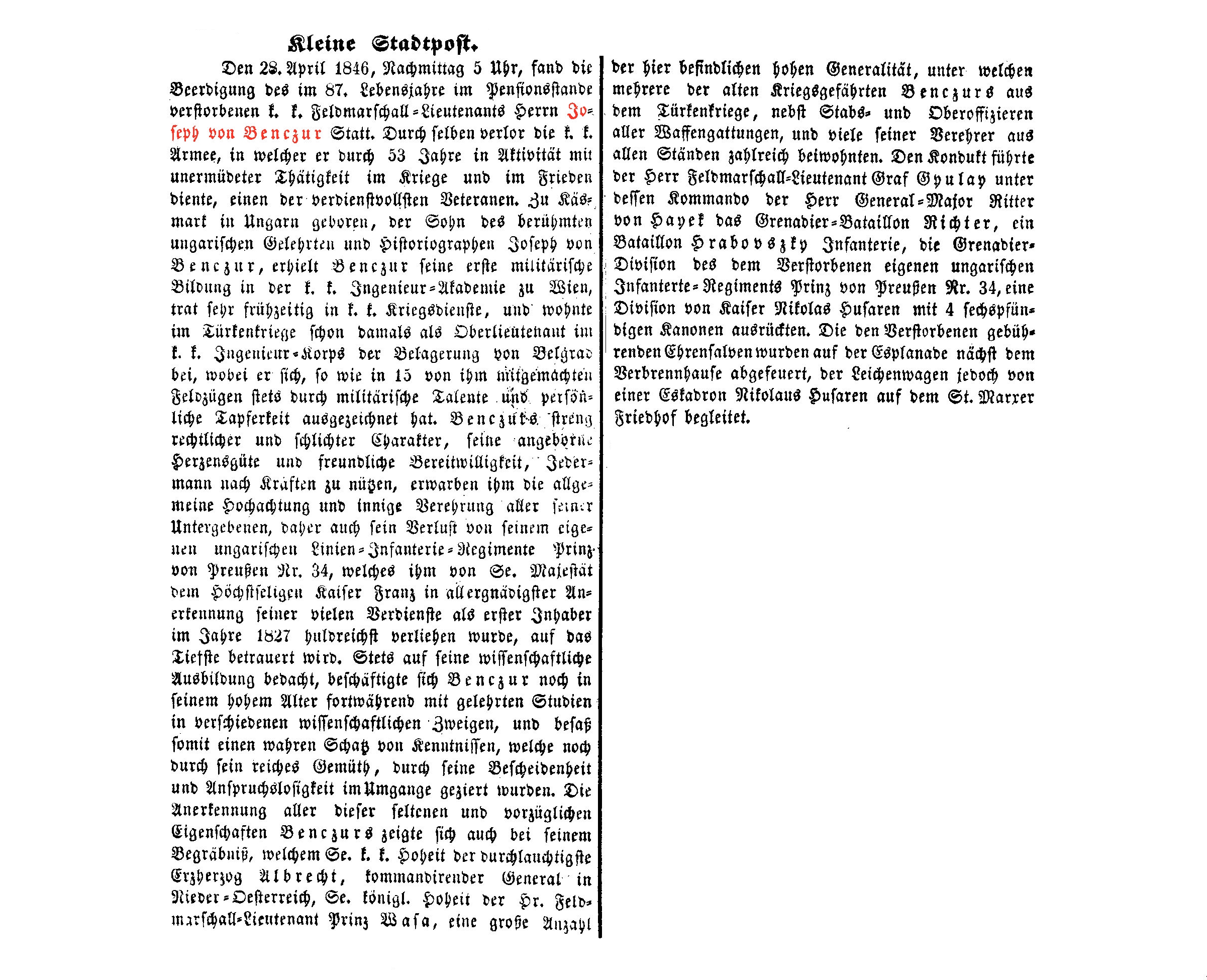 Josef von Benczur, Offizier, FML., † 26.04.1846, Bestattungsdatum: 28.04.1846 im 87. LJ., zuletzt wohnhaft: 1., Singerstraße Nr. 898.