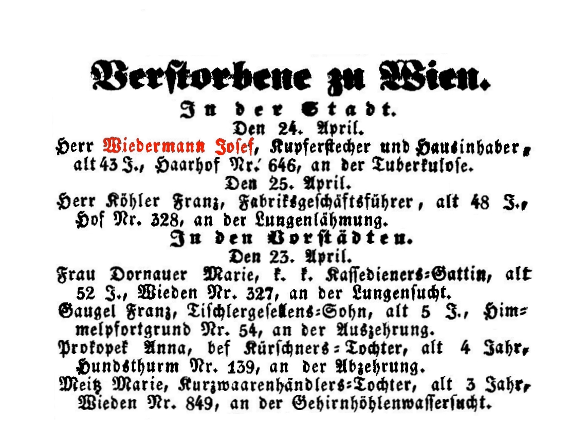 Den 24. April. Herr Wiedermann Josef, Kupferstecher und Hausinhaber,
