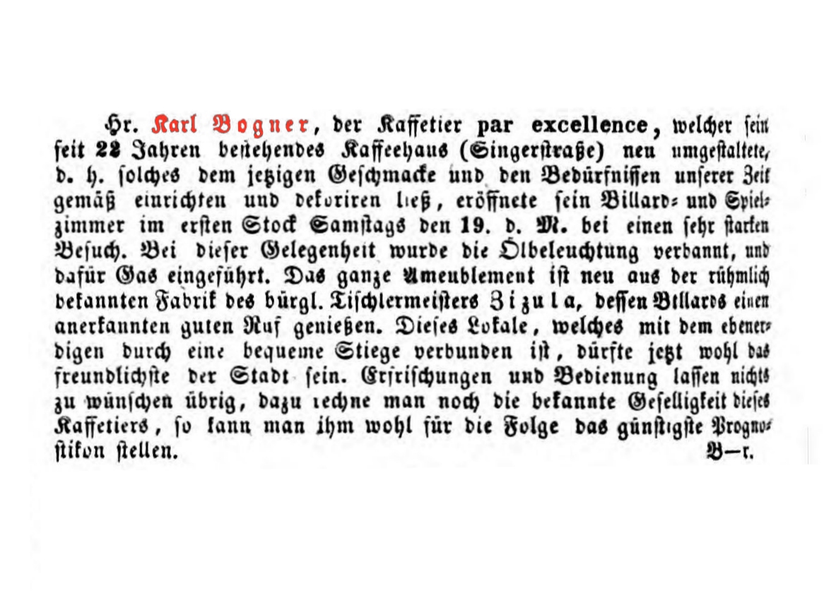 Karl Bogner war von 1824-1850 Besitzer des Kaffeehaus an der Ecke Singerstraße und Blutgasse