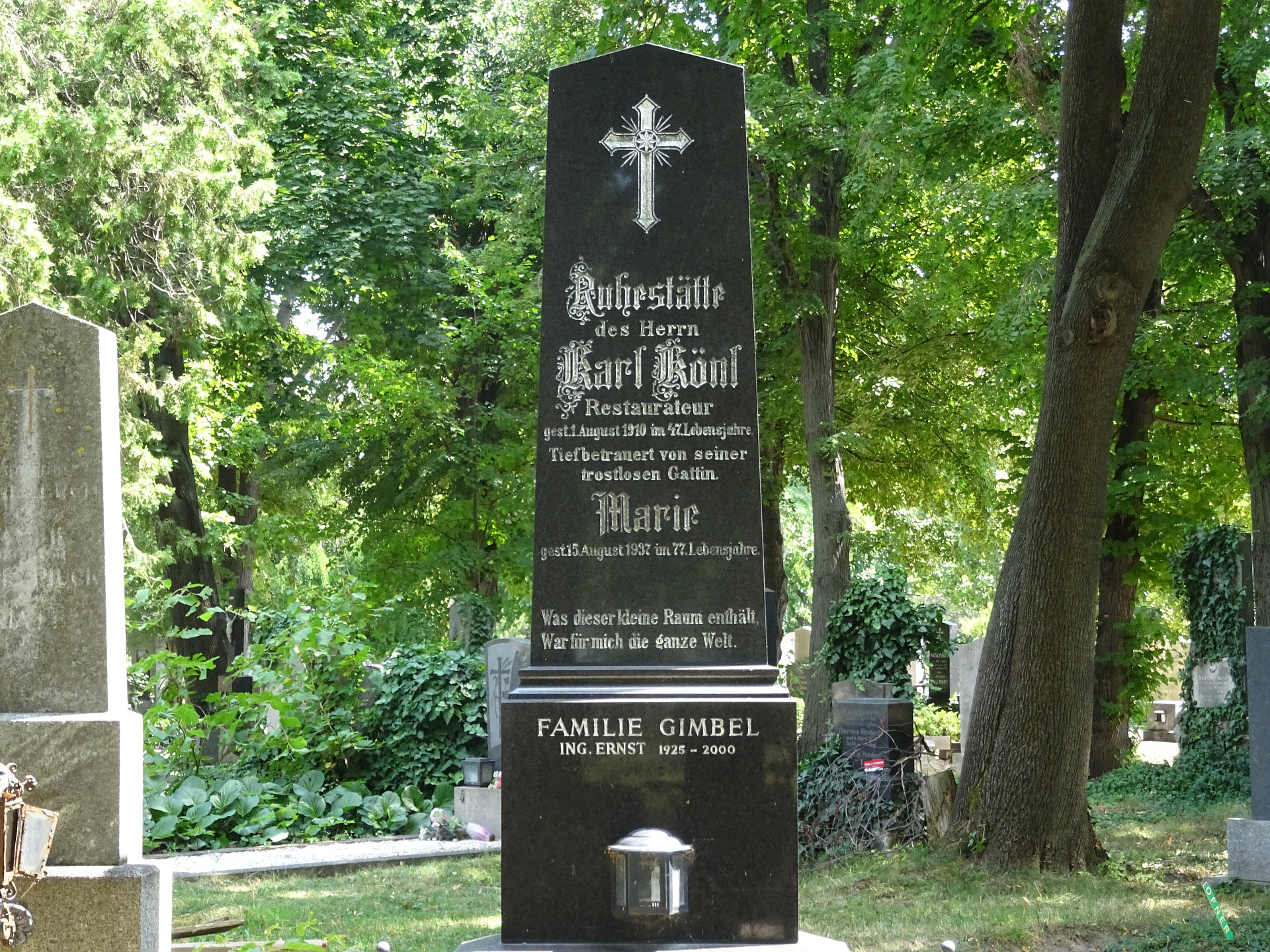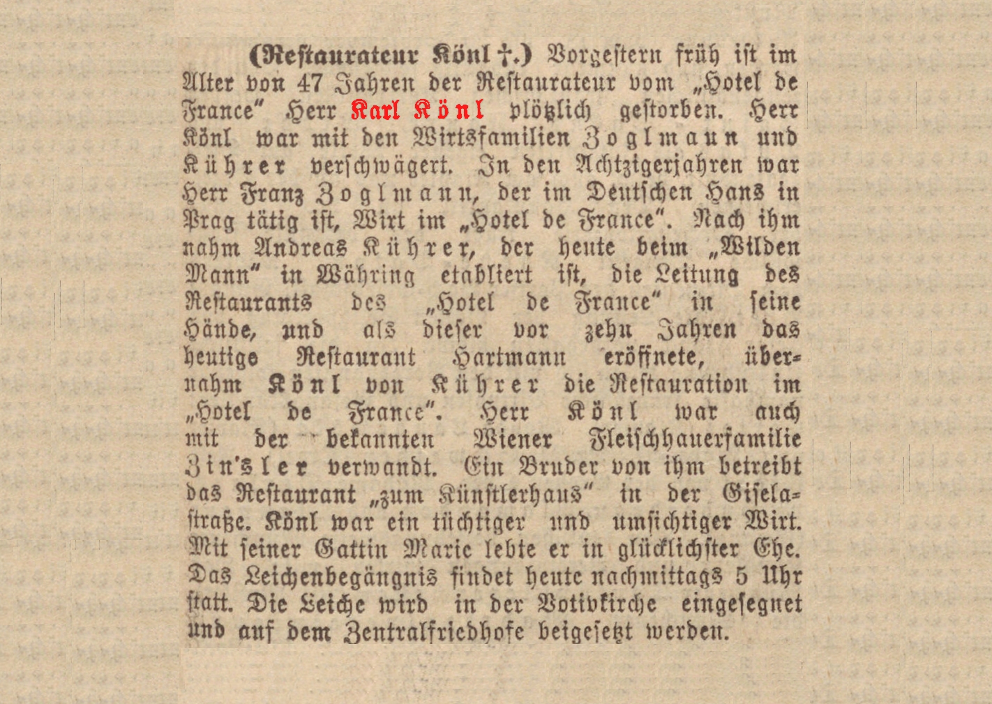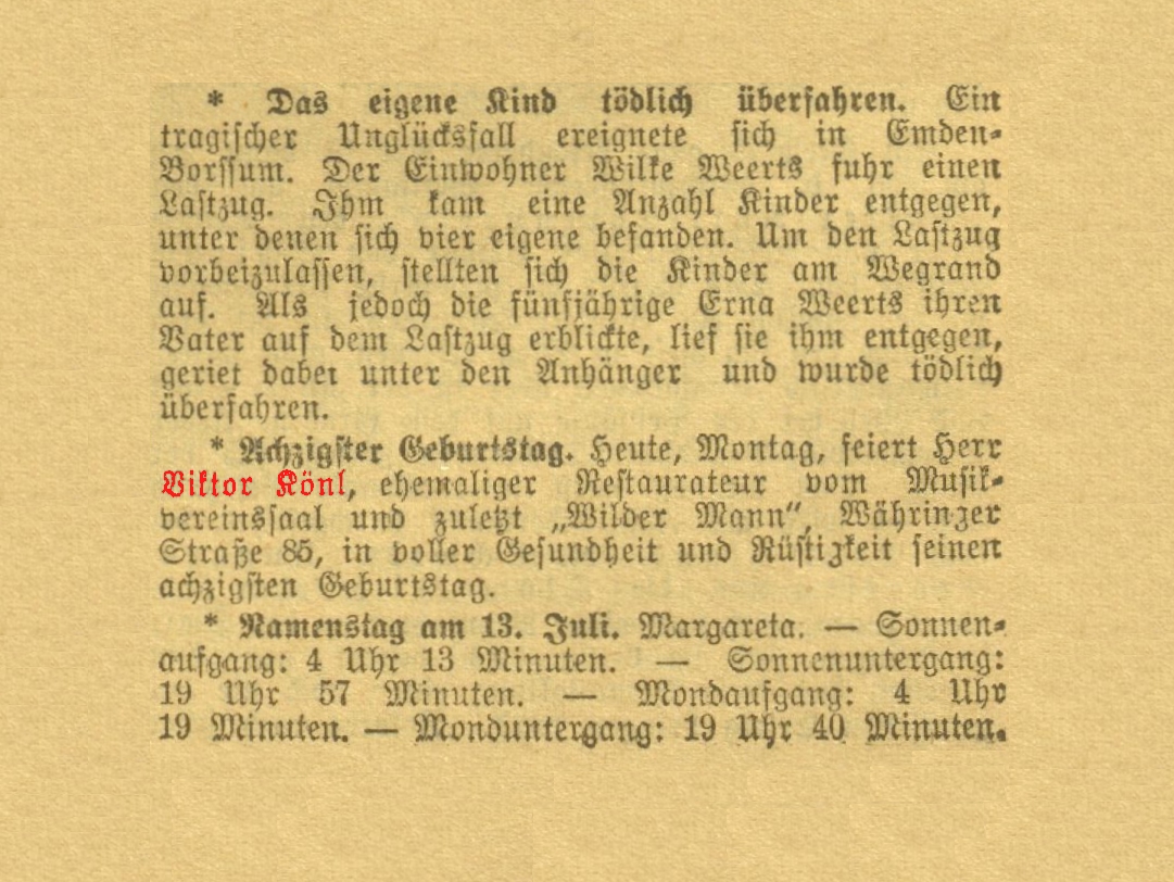 Viktor Könl, * 13.07.1862, ehemaliger Restaurateur vom Musikvereinssaal und zuletzt „Wilder Mann", Währinger Straße 85, † 1945, Bestattungsdatum: 28.05.1945