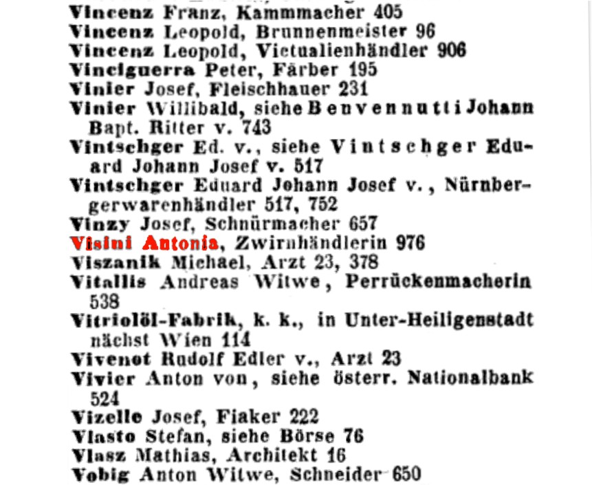 Laut Wiener Zeitung vom 5.6.1841, Seite 5, verstarb Vincenz Visini an Blutschlag. Seine Frau, Antonia Visini, war laut "Handels- und Gewerbs-Schematismus von Wien und dessen nächster Umgebung" Zwirnhändlerin (Nr. 976).
